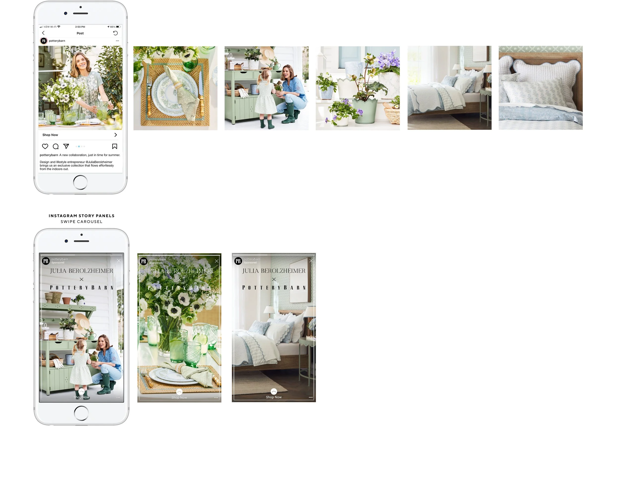The collaboration with the tastemaker and content creator, Julia Berolzheimer, launched on May 6th. We partnered with Julia to develop a summer collection inspired by her signature aesthetic that is adored by her audience of more than 1.3M highly-engaged followers. I worked on the paid social IG Carousel for conversion.